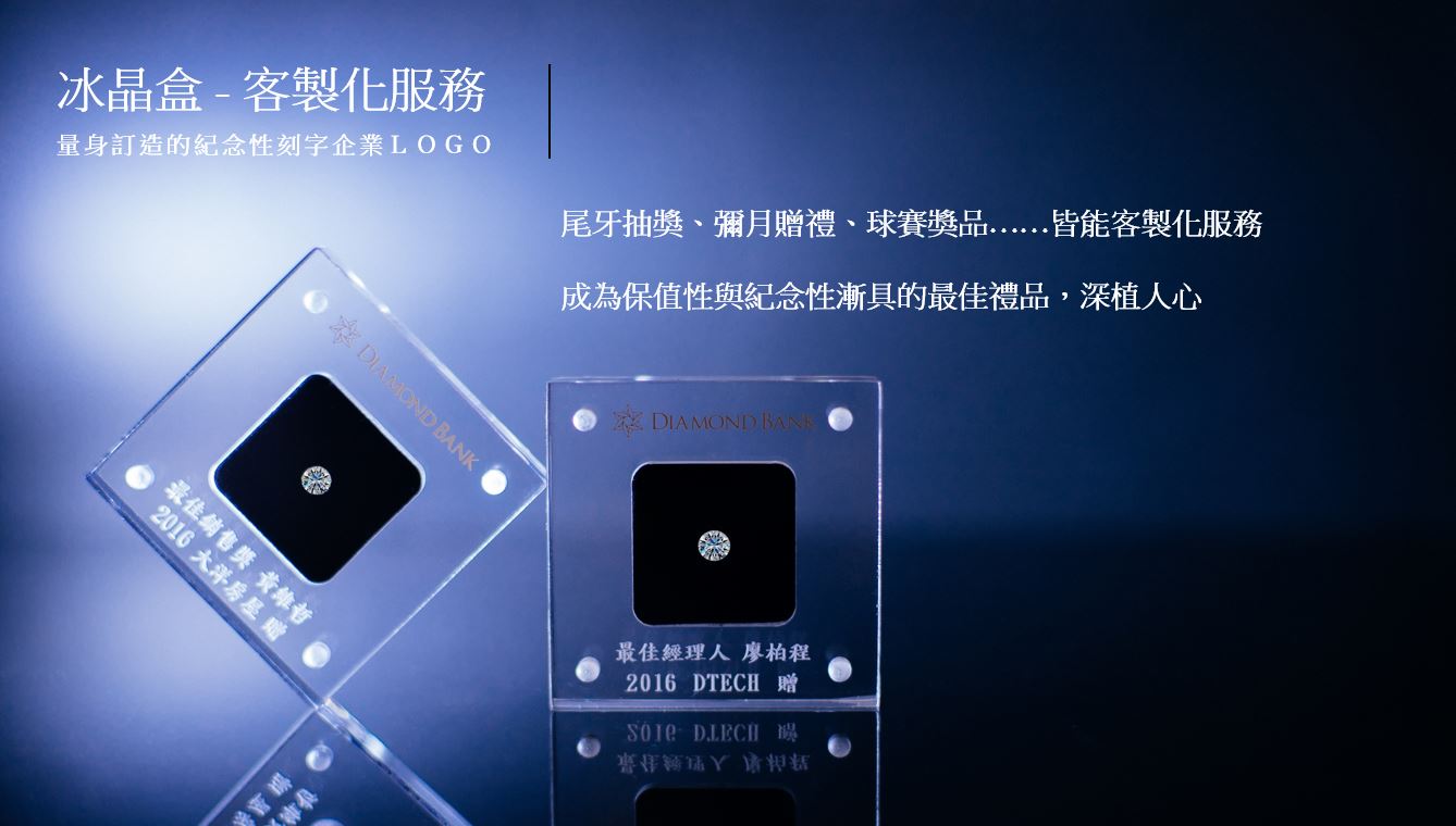 ? 免費提供獨家設計冰晶盒,可針對客戶需求雷射雕刻企業LOGO及獎品細節,讓裸鑽成為兼具保值性及紀念性的最佳禮品。