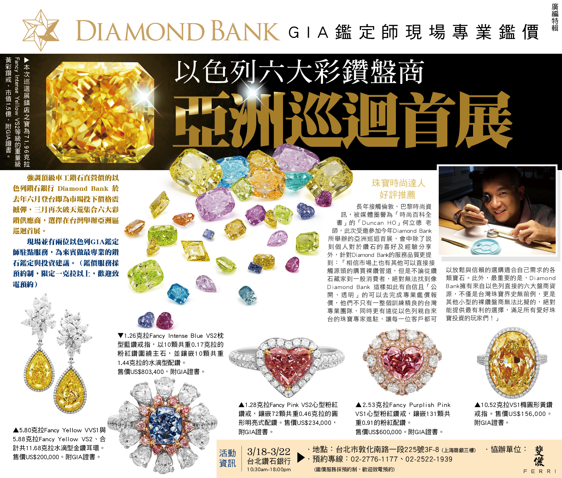 「強調頂級車工鑽石直營價的以色列鑽石銀行 Diamond Bank 於去年六月登台即為市場投下價格震撼彈,三月再次破天荒集合六大彩鑽供應商,選擇在台灣舉辦亞洲區巡迴首展。現場並有兩位以色列GIA鑑定師駐點服務,為來賓做最專業的鑽石鑑定與投資建議。」
