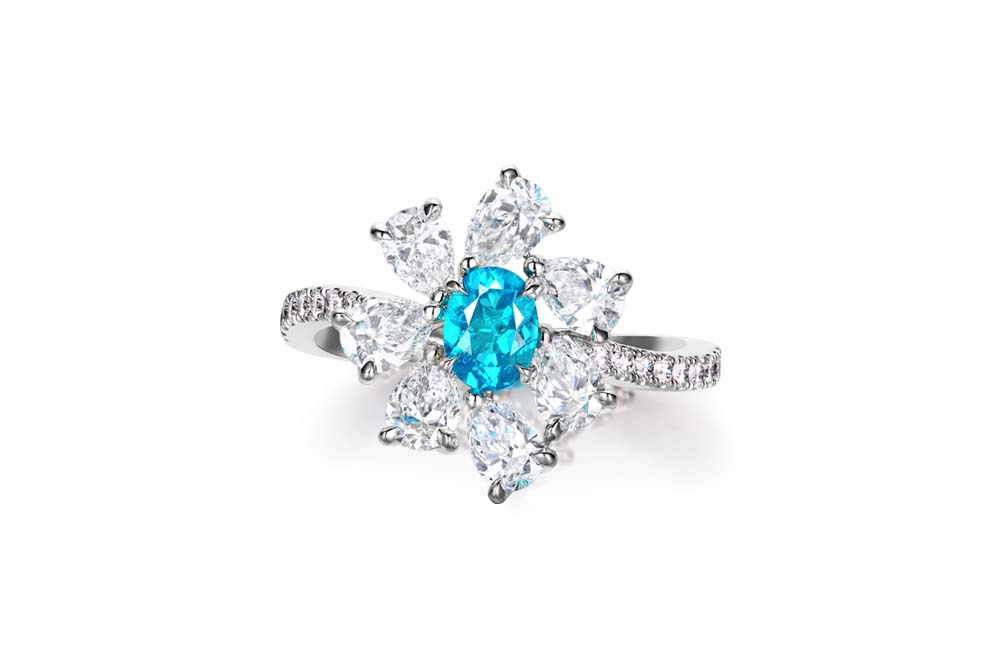 Paraiba碧璽的迷人之處在於,藍綠各半的色澤從寶石中閃爍出獨特火光,此螢光感是調色盤無法創造的,彷彿中南美洲熱帶雨林裡的藍閃蝶,振翅漫飛在叢林裡展現出金屬藍的螢光色彩,吸引所有人的視線。