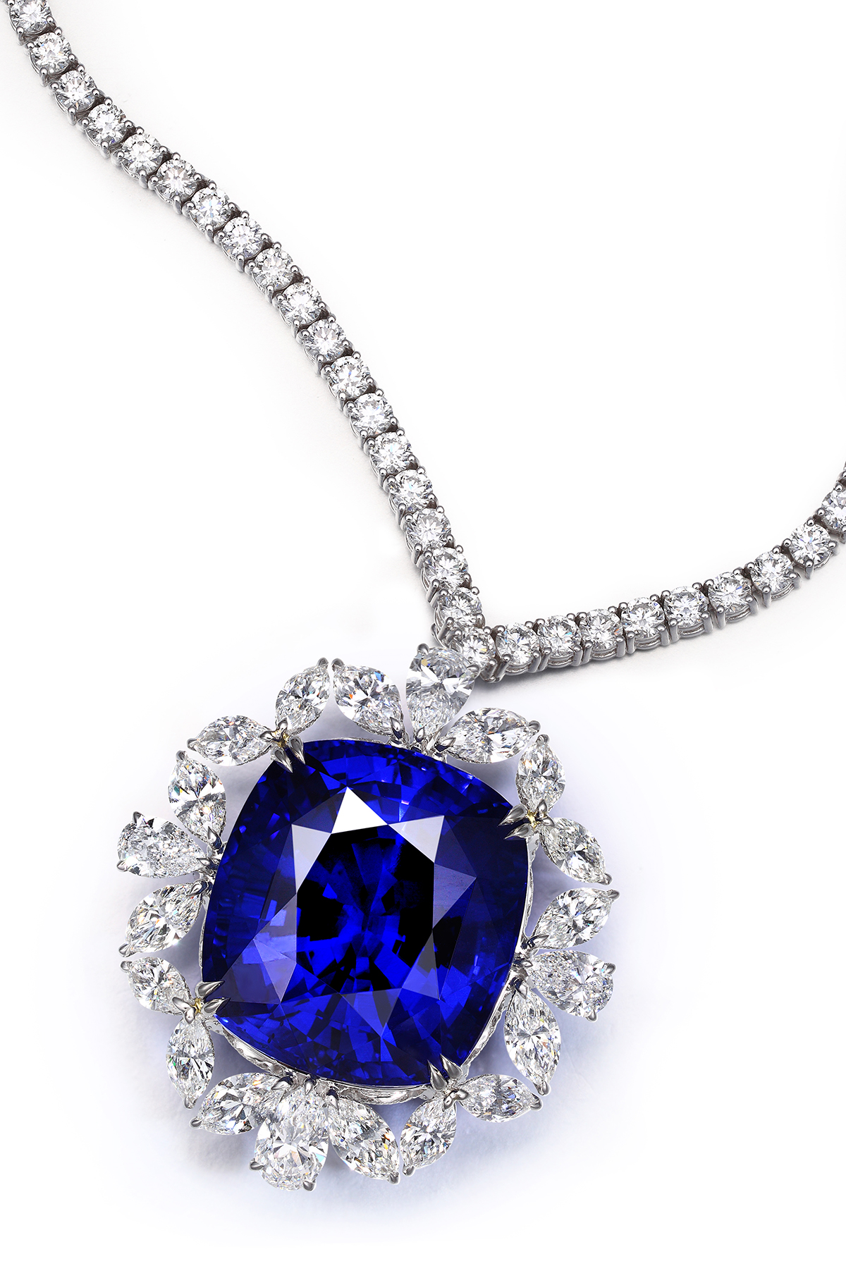 展覽中奪下最大克拉數后冠的122克拉藍寶套鍊,國際權威鑑定室在其GIA專書報告中寫道:「此件藍寶石作品的藍色色澤,是世間萬物與人類語言範疇內都難以形容比擬的極致絕美。」超過100克拉的晶體,這顆非凡的藍寶石幾乎呈現無瑕玻璃體的狀態,且中等深飽和的藍紫色均勻分布在寶石的各個稜面,其尺寸、完美車工、顏色和淨度都具有無價之寶的特徵。