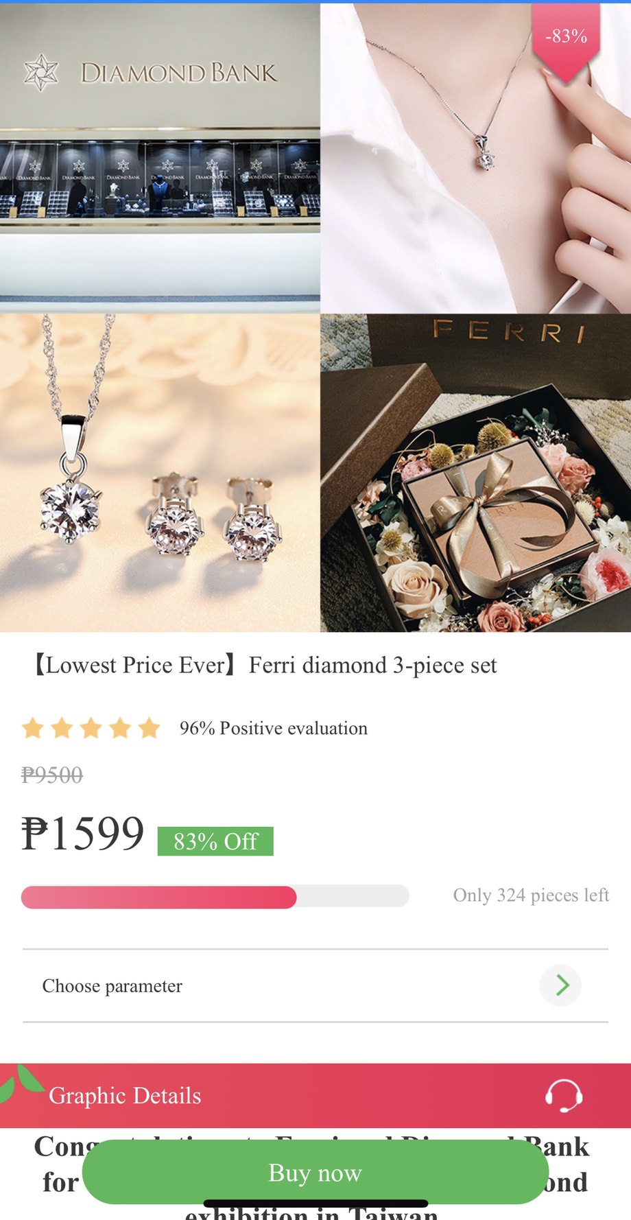 新北市一名王姓男子,在網路上看到掛名國內高級珠寶品牌斐儷珠寶及鑽石銀行(Diamond Bank)所刊登的珠寶廣告,內文為品牌週年慶優惠,購買耳環、項鍊加上戒指三件組,售價僅需新台幣999元。