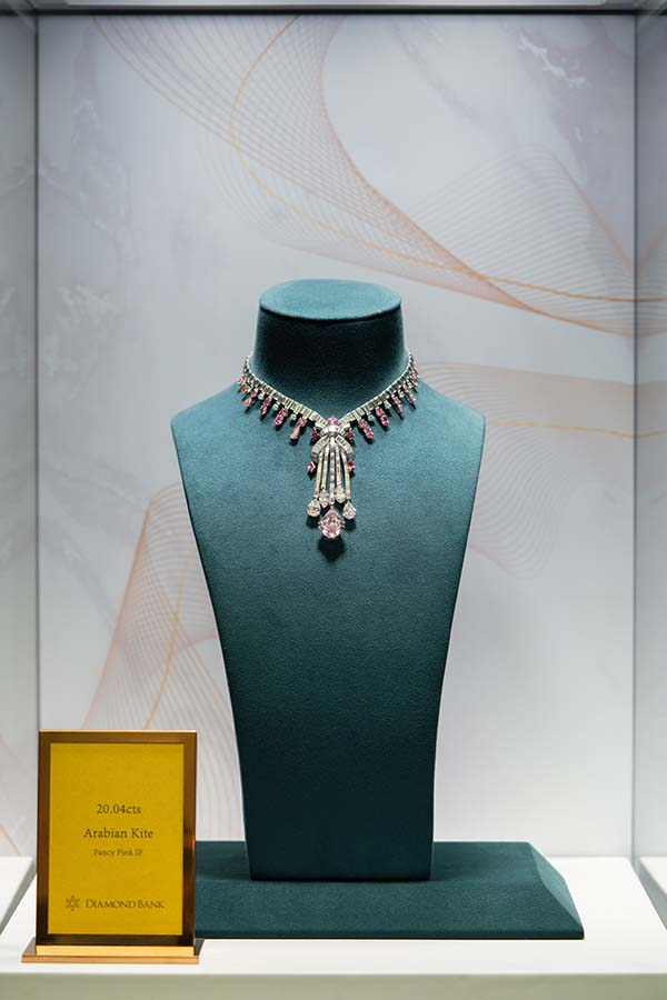 其中一件沙烏地阿拉伯公主擁有的粉紅鑽項鍊,主石是一顆20克拉風箏形切割粉紅鑽,鍊圈上鑲滿25顆阿蓋爾粉紅鑽,每顆粉紅鑽也都有1克拉大小,是皇室委由梵克雅寶(Van Cleef & Arpels)訂製,是Diamond Bank總經理陳昱羲透過國際友人借展來台,身價達10億台幣。